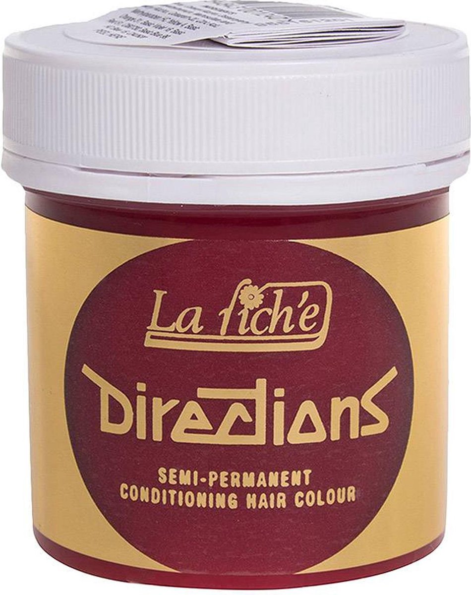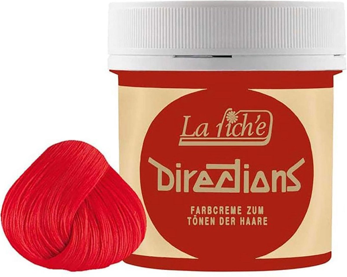 Directions Colours van La Riche. Direction Colours is een semi-permanente haarkleuring in pastavorm met de meest gekke kleuren. Directions Colours kan worden toegepast op natuurlijk haar, maar het beste resultaat bereik je als het haar geblondeerd is. Het geeft geen dekking op wit of grijs haar. Directions Colours is vrij van ammoniak en bevat geen waterstofperoxide.Directions Colours verkrijgbaar in 34 kleuren ! Een haarkleur bereiken van het brede scala aan waanzinnige en levendige kleuren van Directions Colours, en alle kleuren kunnen met elkaar gemengd worden om een eigen unieke tint te maken. Directions Colours producten van La Riche zijn niet getest op dieren. Gebruik: Was het haar eerst met een zure pH evenwichtige shampoo. De shampoo zal het haar de correcte zure balans geven, om zo met de La Riche Directions kleurcrème het beste resultaat te bereiken. Kam de La Riche Directions kleurcrème door het haar tot het emulgeert, zo kan het kleurpigment van de La Riche Directions schuimend het haar binnendringen. Lichtere lokken meerde malen doorkammen. De inwerktijd is tussen de 15 en 30 minuten. Door de warmte van een plastic muts bereik je met de haarkleuring van La Riche Directions een nog beter resultaat.Spoel het haar grondig uit met warm water totdat alle residu kleurcrème is verwijderd. Alle kleuren van la Riche Directions kunnen onderling worden gemengd, om zo je eigen unieke kleur te creëren. Als er meer dan één kleur wordt toegepast moet het haar afzonderlijk worden gewassen en gedroogd. Het haar moet met de grootste zorg worden behandeld, wanneer gebleekt haar gedeeltelijk word gekleurd.