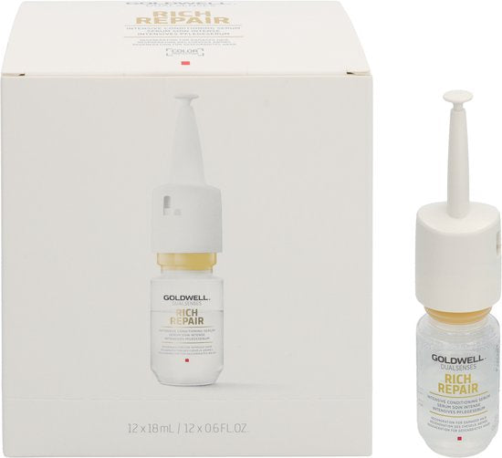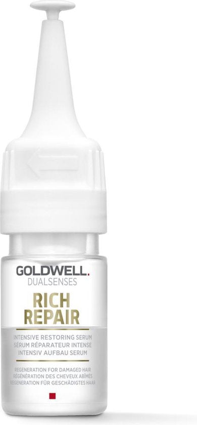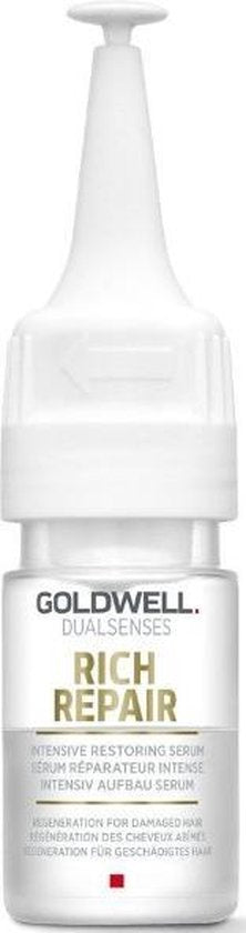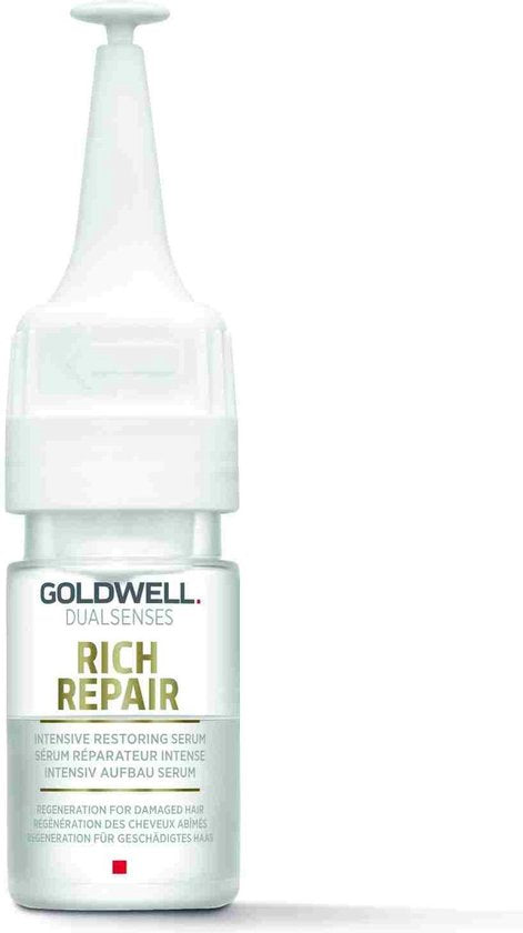 Goldwell Dualsenses Rich Repair Regeneration Serum is een serum voor droog en gestrest haar. Het regenereert het haar erg sterk en snel. Goldwell Dualsenses Rich Repair Regeneration Serum geeft het haar de gewenste, ultieme glans. Het serum beschermt het haar tegen de hitte van stylingtools en is direct voel- en zichtbaar na gebruik. Het Care en Repair System zorgt voor extra verzorging voor droog en gestrest haar.