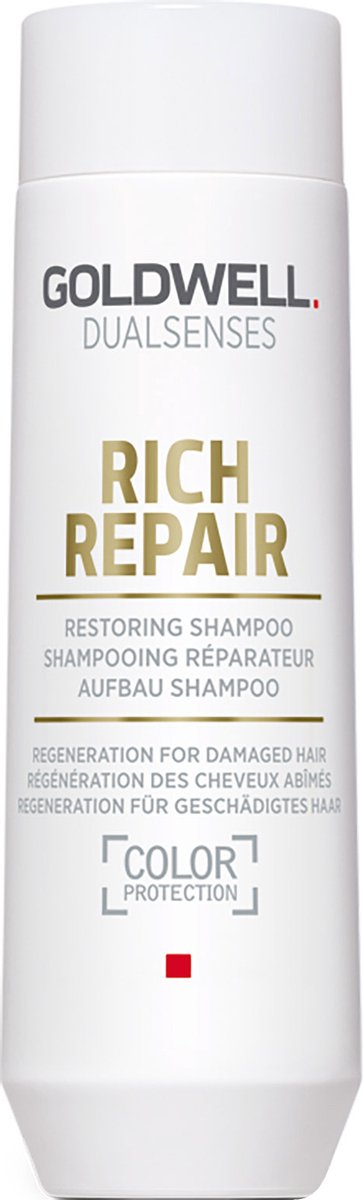 Repair Shampoo die droog en beschadigd haar mild, doch doeltreffend reinigt en de basis legt voor het benodigde herstel! De Goldwell Dualsenses Rich Repair Shampoo bevat pashima-zijdeproteïnen. Deze zorgen voor een zichtbaar gezondere glans en haar dat zijdezacht en soepel aanvoelt. De shampoo geeft een verzorgende reiniging met herstellend effect. Gebruiksaanwijzing van de Goldwell Rich Repair Shampoo: * Breng een juiste hoeveelheid Rich Repair Shampoo aan op vochtig haar. * Masseer in totdat het schuimt. Spoel goed uit. * Sluit af met de Goldwell Dualsenses Rich Repair Restoring Conditioner (https://www./product/goldwell-dualsenses-rich-repair-conditioner). * Gebruik voor een optimaal resultaat ook de andere producten uit de Goldwell Dualsenses Rich Repair lijn. Bestel dus nu de Goldwell Dualsenses Rich Repair Shampoo, dan zorgen wij dat deze snel bij je wordt bezorgd!