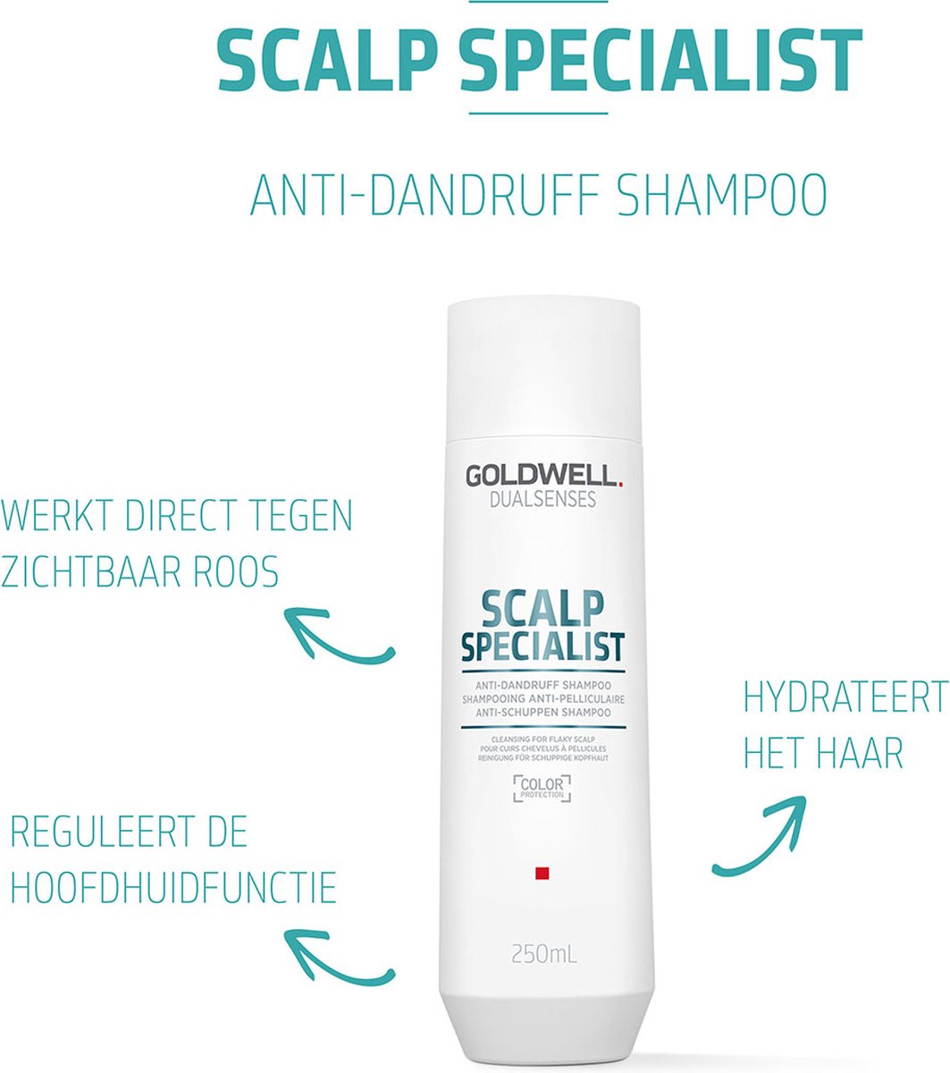 Anti-roos shampoo die je haar reinigt, maar essentieel talg niet aanraakt, zodat de hoofdhuid kalmeert en roos verdwijnt! Heb je last van roos en ben je op zoek naar een kwalitatieve shampoo die je er al vanaf de eerste behandeling vanaf helpt? De Goldwell Dualsenses Scalp Specialist Anti-Dandruff Shampoo is het product voor jou! Deze shampoo bevat het unieke Regulation System met Octopirox, Zinc Pyrithione, Hydro-limoenextract en Instant Microfluid Technology. Een hele mond vol, maar dan krijg je ook direct effect! De functies van de hoofdhuid worden gereguleerd en je roos is al vanaf de eerste behandeling minder! Daarnaast wordt nieuwe roosvorming voorkomen zodat je er écht vanaf komt! Gebruiksaanwijzing: Aanbrengen op vochtig haar, goed inmasseren en daarna zorgvuldig uitspoelen. Test het zelf, bestel Goldwell Dualsenses Scalp Specialist Anti Dandruff Shampoo voordelig online bij !
