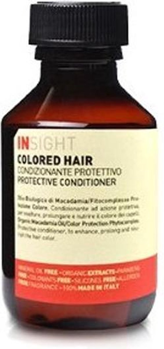 Insight Colored Hair Protective Conditioner beschermt het haar tegen invloeden van buiten af die het haar en de haarkleur kunnen aantasten. Ook dit product van Insight is opgebouwd uit voornamelijk natuurlijke ingrediënten, zoals macadamia-olie, tarwekiemolie, olijfboter, arganolie, rijstzemelenolie en phytocomplex. Deze ingrediënten voeden je haar en beschermen het. Ingrediënten zoals henna-extract, mangobomen en druivenpitolie zijn toegevoegd om de levensduur van je haar en de kleur te verlengen. De conditioner voedt het haar diep en laat het zacht en soepel aanvoelen, daarnaast maakt het het haar makkelijk doorkambaar. Net als alle andere producten van Insight bevat de Insight Colored Hair Protective Conditioner geen SLS, minerale oliën, parabenen, siliconen, kunstmatige kleuren en geuren die allergische reacties kunnen veroorzaken. Je merkt de werking van de conditioner het beste wanneer deze wordt gecombineerd met Insight Protective Shampoo voor gekleurd haar. Voor nog meer kleurbescherming is het aangeraden om ook de Protective Mask in combinatie met de andere producten van de lijn te gebruiken.