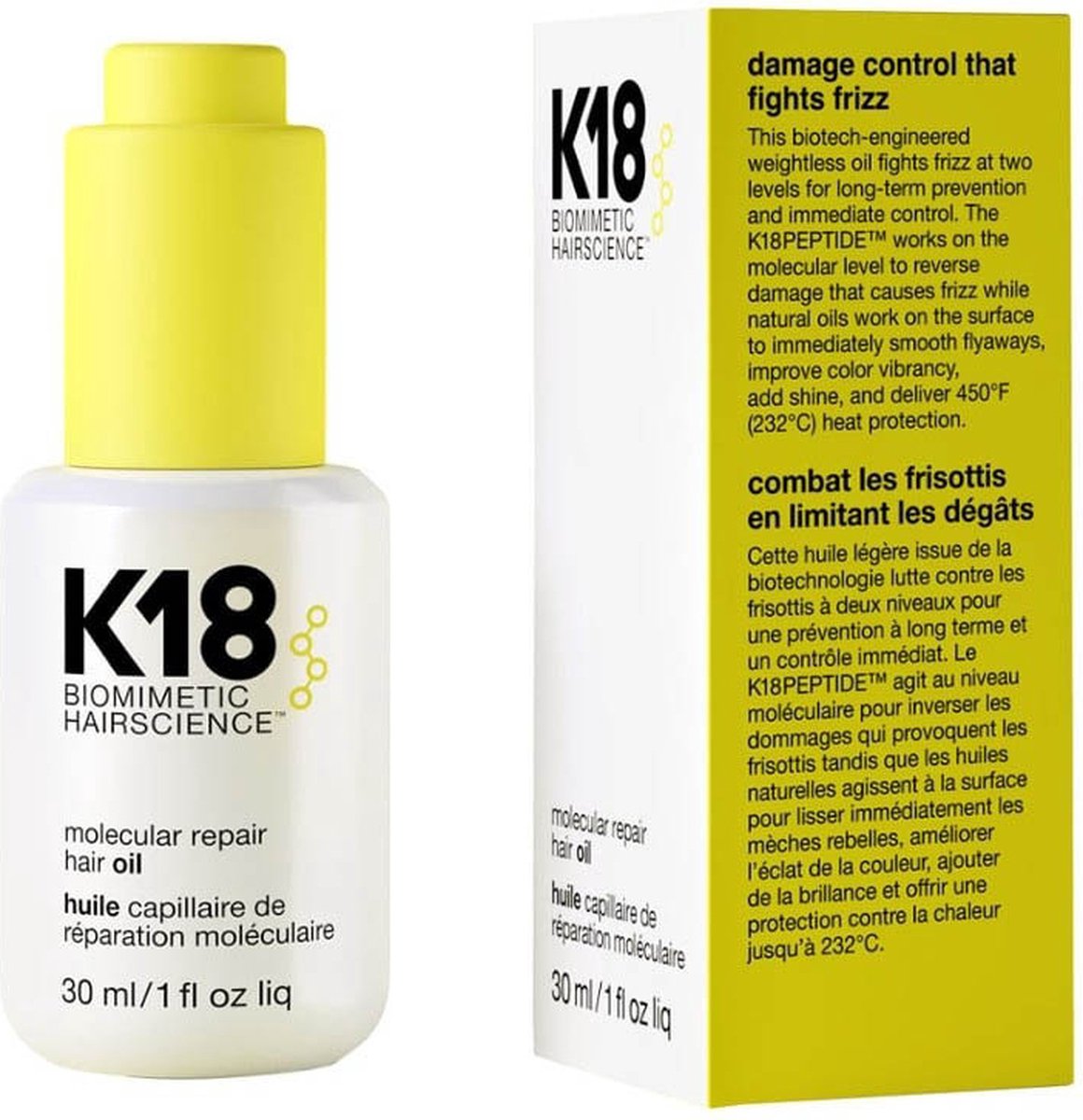 De K18 Molecular Repair Hair Oil 30 ml is een revolutionair haarverzorgingsproduct dat beschadigd haar herstelt. Met de geconcentreerde formule van 30 ml dringt de olie diep door in het haar en herstelt zelfs het meest beschadigde haar. De innovatieve K18-peptide technologie herstelt en versterkt de natuurlijke keratine in het haar, waardoor het zijn gezonde staat terugkrijgt. Het resultaat is zachter, sterker en gezonder haar met verminderde gespleten haarpunten en verbeterde elasticiteit. K18 Molecular Repair Hair Oil is geschikt voor alle haartypes, veilig voor gekleurd haar en vrij van sulfaten, parabenen en ftalaten. Geniet van gezond, glanzend en veerkrachtig haar met dit baanbrekende product! Belangrijkste eigenschappen * Maakt het haar zacht en glazend. * Veilig voor gekleurd haar. * Verbetert elasticiteit. * Verzorgt en versterkt het haar. * Vrij van sulfaten, parabenen en ftalaten. Gebruiksaanwijzing * Te gebruiken op handdoekdroog haar. * Neem een kleine hoeveelheid van de olie en verdeel deze gelijkmatig over het haar vanaf de haarwortels tot in de punten. * Masseer zachtjes in en laat het haar volledig drogen. * De olie kan ook gebruikt worden op droog haar om de glans te verbeteren en het haar te beschermen tegen verdere beschadiging. K18 Molecular Repair Hair Oil 30 ml kopen bij Shop de K18 Molecular Repair Hair Oil 30 ml en wij zorgen dat het zo snel mogelijk bij je wordt bezorgd!
