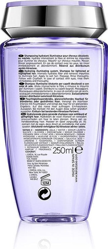 Kérastase Blond Absolu Bain Lumière Verzorgende shampoo voor blond haar is een lichte, hydraterende formule op basis van Hyaluronzuur. De shampoo is ideaal voor haar met highlights, maar ook gebleekt, grijs of licht ontkleurd haar. De subtiel reinigende formule maakt de vezel glad en hydrateert het haar van aanzet tot punt, om het haar luchtig te maken en het blond weer te laten stralen. De doordachte combinatie van Hyaluronzuur en Edelweiss geeft deze formule een hoge concentratie van antioxidanten, om beschadigingen aan het haar te voorkomen. Hyaluronzuur geeft het haar een optimale hydratatie en maakt de vezel glad, voor een heerlijk zacht gevoel. Het haar heeft een natuurlijke glans en is klaar voor verdere styling.