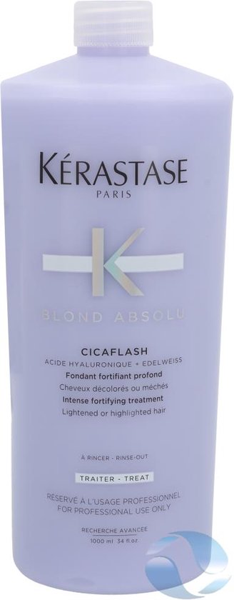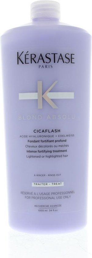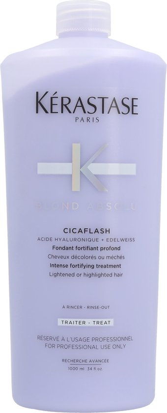 Kérastase Blond Absolu Cicaflash Conditioner is een melkachtige lavendel gel die de herstellende werking van een masker biedt, maar met de luchtige afwerking van een conditioner. Kérastase Blond Absolu Cicaflash Conditioner is geschikt voor gehighlight of andere tinten blond haar. De conditioner herstelt de haarvezels van binnenuit door ze intensief te voeden. Dat is te danken aan de formule van hyaluronzuur en edelweiss bloem-extract. Deze ingrediënten verzachten en versterken het haar, voorkomen haarbreuk en beschermen het haar tegen erosie. Kérastase Blond Absolu Cicaflash Conditioner hydrateert en verzacht het haar en geeft het een prachtige glans.