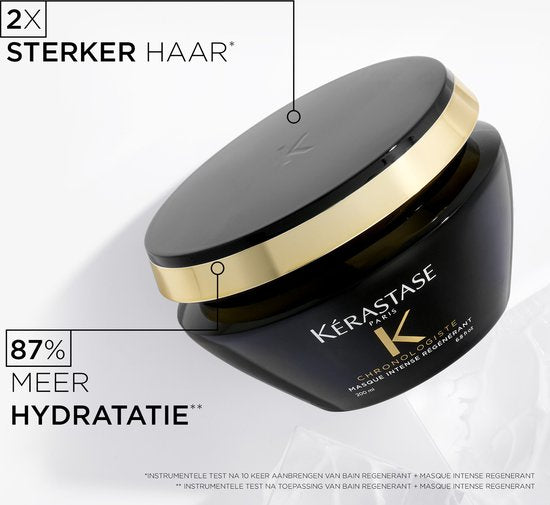 De Kérastase Chronologiste Masque Intense Régénérant is een revitaliserend masker speciaal voor ouder wordend haar. Dit fijne haarmasker is verrijkt met hyaluronzuur, abyssine en vitamine E wat zorgt voor een langdurige hydratatie, zachtheid en een jeugdige glans. Hierdoor worden tekenen van veroudering an hoofdhuid en haar bestreden wat zorgt voor een algehele verjonging van het haar. Het masker zorgt voor een intensieve hydratatie, langdurige frizz-control en 6x meer glans. De verzorgende formule voedt iedere vezel en versterkt deze wat resulteert in jeugdige veerkracht en levendigheid. Dit masker is verrijkt met de kermerkende Chronologiste-geur met onder andere theeroos, licht hout en musk. Dit masker is anti-veroudering en zorgt voor een jeugdig effect.