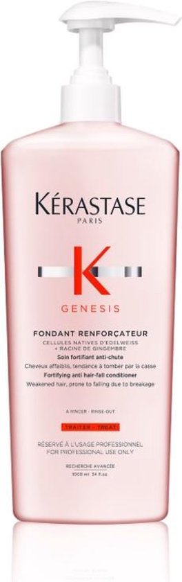 De Kérastase Genesis Fondant Renforçateur Conditioner is een versterkende conditioner speciaal ontwikkeld voor mensen met verzwakt haar. Deze conditioner verbetert de algehele conditie van het haar door je lokken te versterken. Hierdoor wordt haaruitval als gevolg van haarbreuk tot wel 97.7% verbeterd. Door de balsem formule wordt een oplossing geboden tegen zwak haar zonder je lokken te verzwaren. De vezels worden op natuulijke wijze hersteld waardoor ze weer zacht en glanzend worden. De formule van deze conditioner is delicaat genoeg voor dagelijks gebruik en geeft zichtbaar resultaat vanaf het eerste gebruik.