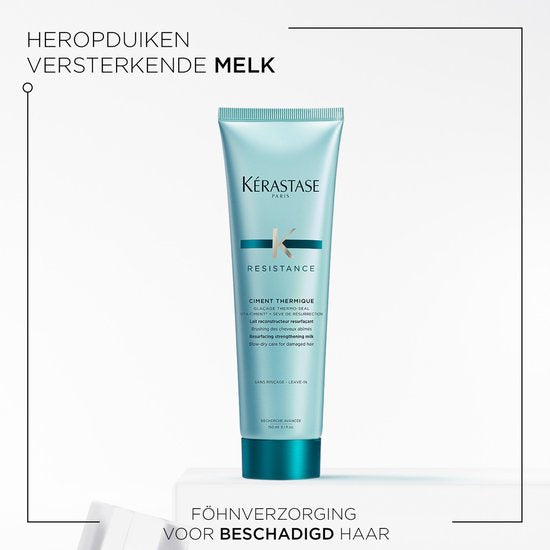 Kérastase Résistance Ciment Thermique Leave-in-crème en hittebescherming voor beschadigd haar is een thermo-actieve herstellende crème voor de behandeling en bescherming van verzwakt en beschadigd haar. De combinatie van Vita-Ciment®, Vita-Topseal en Sève de Résurrection versterkt iedere haarvezel. Het haar wordt gevoed, is gemakkelijk handelbaar en is beschermd tegen hitte tot wel 180°C. De crème verzwaart niet.