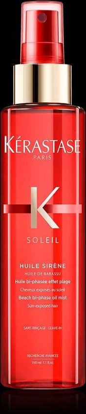 Kérastase Soleil Huile Sirène Oil Mist is een bi-phase haarmist die speciaal is ontworpen voor natuurlijk en droog tot zeer droog haar. De onzichtbare spray biedt dagelijkse bescherming voor het haar en de haarkleur en zorgt voor een prachtige glanzende beach look. De mist is ideaal te gebruiken om het haar te beschermen tegen schadelijke invloeden van de zon en zout of chloor water. De formule is verrijkt met hydraterend Kokoswater en Vitamine E en beschermt tegen chloor, zout en zand. UV-straling heeft een desastreus effect op het haar, het breekt door de haarvezel heen waardoor het het haar blijvend kan beschadigen. De toegevoegde mineralen vormen als het ware een waterafstotend laagje over het haar waardoor het haar optimaal wordt beschermd. De mist voorkomt vrije radicalen die het haar droog en dof maken. Bovendien bevat de Kérastase Soleil Huile Sirene Oil Mist een anti-frizz werking waardoor pluis wordt tegengegaan. Na het gebruik van de haarspray zullen beachwaves versterkt worden en bevat het haar meer textuur. Ook zal de mist een mooie zomerse glans achterlaten. De spray biedt de perfecte combinatie van verzorging en textuur.