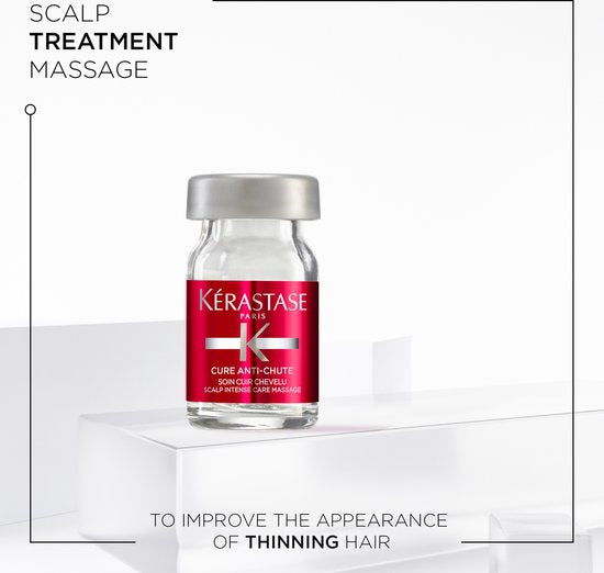 Kérastase Spécifique Cure Anti-Chute à 10 is een intensieve haarkuur tegen haaruitval, die het haar en de hoofdhuid behandelt en haarverlies remt. De haarkuur werkt aan de kwaliteit van nieuwe haren, beschermt het haar tegen oxidatieve stress en verbetert de dichtheid. De innovatieve ingrediënten herstellen de kwaliteit en de soepelheid van de hoofdhuid. Het haar wordt sterker, dikker, krijgt glans en meer volume. Aminexil 15 000 PPM is een waardevolle combinatie van Aminexil®, GlucoLipide GL®, Madecassoside en verbetert de haardichtheid. Het versterkt de haaraanzet waardoor het haar flexibeler en krachtiger wordt. De wortel krijgt zo de mogelijkheid om steviger te verankeren in de hoofdhuid. Rhamnose is een suiker met antiverouderingseigenschappen en is verantwoordelijk voor de productie van collageen en elastine, die steun en flexibiliteit geven aan de hoofdhuid.