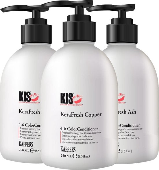 Kis KeraFresh Color Conditioner is een intensief verzorgende en kleurende conditioner. Ideaal voorhet opfrissen van de haarkleur. Geschikt voor alle haartypes.Bevat keratine (KIS MW 150) voor optimaal haarherstel. Dekleurpigmenten werken opbouwend en geven een verfrissendeffect op zowel gekleurd als natuurhaar. HOE TE GEBRUIKEN Breng de KeraFresh aan op gewassen handdoek droog haar enkam dit door. Na 10 minuten inwerken grondig uitspoelen. Gebruikvoor het aanbrengen van de KeraFresh daarvoor geëigendehandschoenen. KeraFresh kan afgeven op kleding en beddegoed