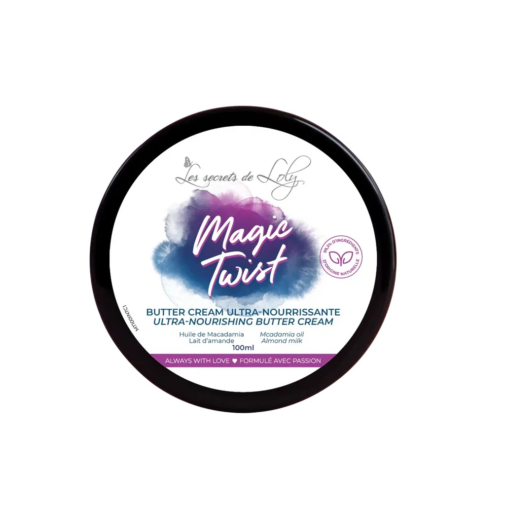 De Magic Twist crème is een van de meest voedende producten uit het assortiment. Deze crème met de textuur van een boter voedt het haar intensief. Met zijn cocktail van soja-, macadamia- en amandelolie werkt Magic Twist echt voedend en verzachtend zonder een vettig laagje achter te laten. Doe je twists, vlechten, braid outs of twist outs, het zal je helpen om mooie definitie te krijgen. Je kunt de crème ook gebruiken om te voeden zonder een beschermend kapsel te maken. Geschikt voor zeer krullend en kroeshaar.