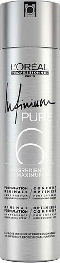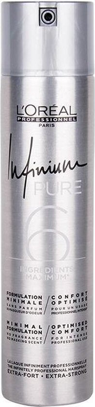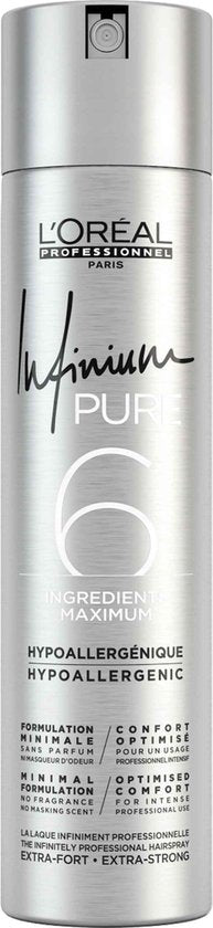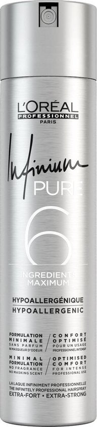 De L'Oréal Professionnel Infinium Pure Extra Strong is een professionele haarspray voor alle haartypes. De haarspray heeft een extra sterke holdfactor waardoor je haar langdurig in model blijft. De formule is vrij van parfum waardoor dit product comfort en sterkte samenbrengt. De formule is gemaakt van een minimum aan ingrediënten wat resulteert in 6 werkende bestandsdelen zonder toegevoegde geurstoffen waardoor een hypoallergene formule tot stand is gekomen wat voor een optimaal comfort zorgt. Hierdoor heeft deze haarspray een minimaal risico op een allergische reactie. De ultrafijne mist zorgt ervoor dat de spray sneldrogend is en voorkomt stijf en plakkerig haar. De haarspray laat dus geen residu achter in het haar. Verder zorgt de fijne mist voor een lichte verstuiving waardoor het gemakkelijk is om een gelijkmatige, nauwkeurige verspreiding te krijgen. De haarlak geeft je kapsel een natuurlijke glans.