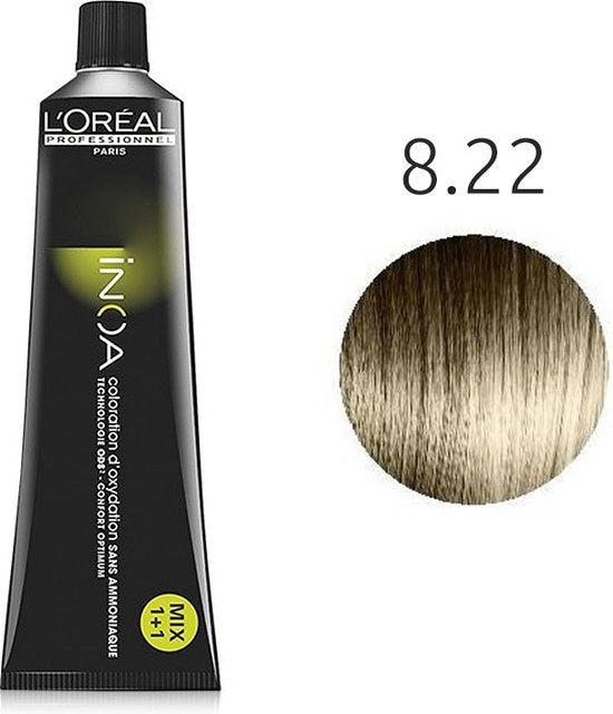 L’Oréal INOA bevat geen ammoniak, hierdoor is de haarverf geheel geurloos en heeft het optimaal respect voor het haar. Tot wel 6 weken intensieve hydratatie en verzorging. Deze haarkleuring heeft een unieke technologie die de kracht van olie gebruikt om de werking van de kleur te optimaliseren. Dit met een minimale concentratie van het alkalisch bestanddeel. Ga voor een perfect resultaat van een permanente kleuring! De kleur van deze tube is 8.22.