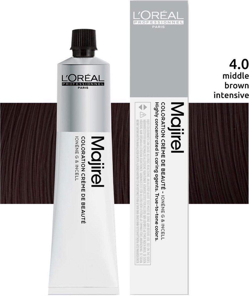 L'Oréal Majirel Absolu 50 ML 4.0 L'Oréal Majirel haarverf biedt intense, diepe kleuren met een maximale houdbaarheid! Voor de meest professionele haarkleuring, die inmiddels is doorontwikkeld tot absolute perfectie, ga jij natuurlijk ook voor de kleuren van L'Oréal Majirel! Met de kleuren van Majirel ga je voor maximale houdbaarheid en zeer intense, diepe kleuren. Dankzij de eindeloze hoeveelheid kleuren vind je altijd de kleur die bij jouw persoonlijkheid past. Majirel geeft 100% grijsdekking en zorgt altijd voor een natuurlijke, sprankelende haarkleur bij elk haartype! De belangrijkste kenmerken: Geschikt voor elk haartype Voor deelkleuren of een totale haarkleuring 100% grijsdekking Verheldering tot 3 kleurhoogtes Diepe, rijke en intensieve kleuren Houdt je haar in conditie dankzij de Ionène en Incell technologie Langhoudbare, permanente oxidatiekleuring