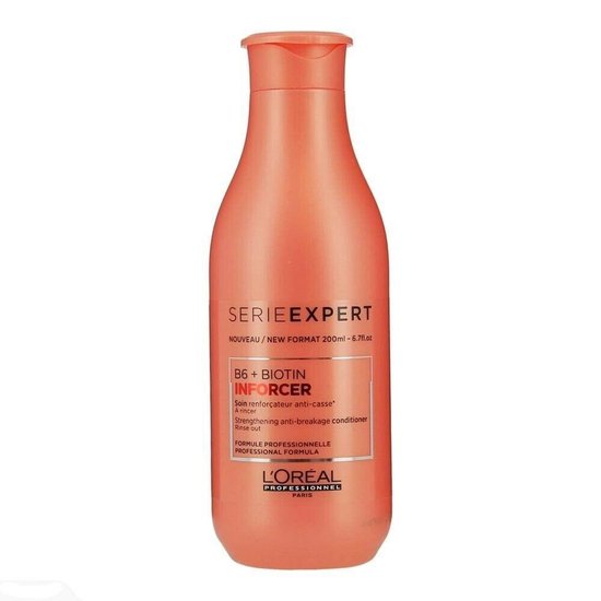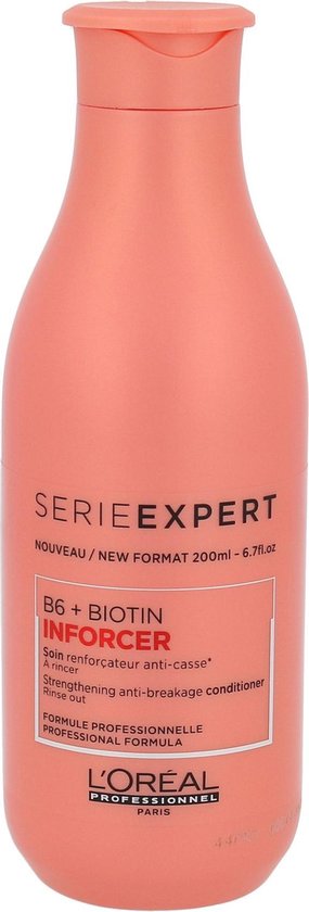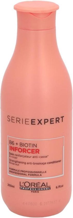De L’Oreal Professionnel Serie Expert Inforcer conditioner is verrijkt met een ingrediënt genaamd biotine. Dit is een in water oplosbare vitamine die het lichaam en haar helpt bij het omzetten van eiwitten, vetten en koolhydraten. Hierdoor worden de voedingsstoffen en vitaminen beter opgenomen. Biotine speelt dus een essentiële rol bij het creëren en behouden van gezond haar. Door het toevoegen van dit ingrediënt wordt het gemakkelijker om andere vitamine op te laten te nemen waardoor de werking van deze ingrediënten wordt verbeterd. Dit is erg gunstig voor een ander belangrijk ingrediënt in de formule van de conditioner, vitamine B6. Dit ingrediënt draagt bij aan de vermindering van haaruitval. Door vitamine B6 toe te voegen aan de haarproducten wordt de kans op haaruitval en haarbreuk significant beter.