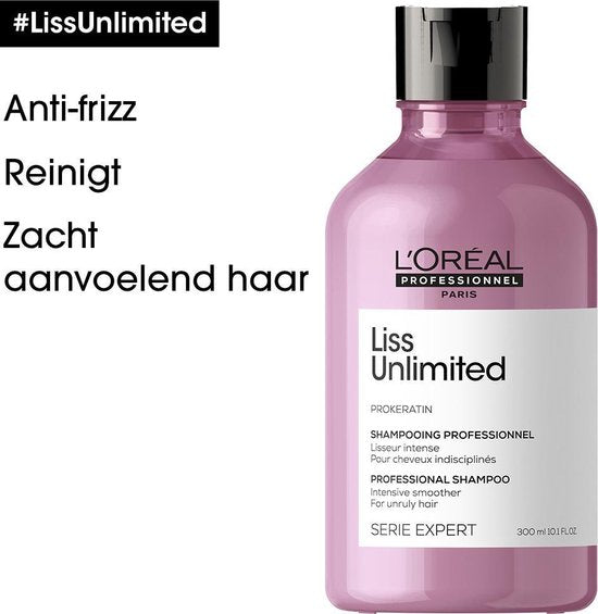 De L’Oréal Professionnel Serie Expert Liss Unlimited Shampoo is een verzorgende en gladmakende shampoo special ontwikkeld voor pluizig, weerbarstig en onhandelbaar haar. De shampoo zorgt ervoor dat het haar gemakkelijker te controleren en in model te brengen is. De unieke formule zorgt ervoor dat de haarstructuur wordt hersteld en versterkt. Daarnaast wordt de hoofdhuid gereinigd en verfrist waardoor het ook gezonder wordt. Doordat de conditie van de hoofdhuid wordt verbeterd, worden de werkzame stoffen van de shampoo beter en sneller opgenomen door de haarwortel waardoor het product nog meer effect heeft als je het langer gebruikt. Het is een anti-frizz shampoo die pluis tegen gaat, en steviger en zacht haar geeft.