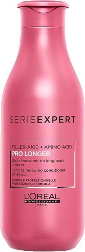 De L'Oreal Professionnel Serie Expert Longer condintior is onderdeel van de Serie Expert Pro Longer-reeks. Die de lengte van het haar dikker maakt. De conditioner is verrijkt met Filler-A100, een molecuul wat de lengte van het haar vernieuwt en de uiteinden van binnenuit vult voor langer en dikker haar. Aminozuren zorgen ervoor dat het haar minder snel breekt en sterker wordt. De haarvezel wordt direct vernieuwd en het haar is sterker en glanzender. De conditioner heeft een heerlijke geur fluweelroosachtige tonen en een sensuele ambergeur.