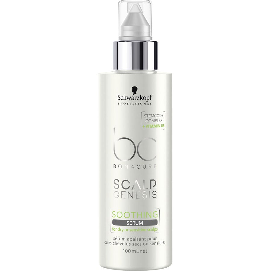 Schwarzkopf Bonacure Scalp Genesis Soothing Serum reinigt de hoofdhuid en gaat irritatie en jeuk tegen. Dit serum met pH 3,5 - 4,5, StemCode™ Complex en Vitamine B5 kalmeert de droge, gevoelige hoofdhuid. Daarnaast brengt het de geïrriteerde huid opnieuw in evenwicht, terwijl de toekomstige haarconditie beschermd wordt. De formule bevat geen siliconen en zorgt ervoor dat essentiële voedingsstoffen verbonden worden met een antibacterieel middel. Hierdoor worden problemen met de hoofdhuid opgelost. Het serum is verrijkt met pro-vitamine B5, deze houden het vochtgehalte van het haar en de hoofdhuid in balans. Daarnaast zit er Allontoïne in, dit heeft een verzachtende en kalmerende werking voor de hoofdhuid. Ook bevat het Soothing Serum Chitosan, een natuurlijk polymeer met anti-bacteriële werking dat je haar beschermt tegen invloeden van buitenaf. Tot slot zit er Bisabolol in, dit is afkomstig van Chamomille en staat bekend om het effectief bestrijden van jeuk.