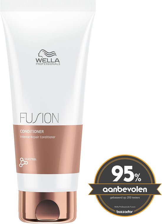 Wella Fusion Intense Repair Conditioner is een ontwarrende conditioner die het haar intensief herstelt. Door kammen of gebruik van hittetools kan haar beschadigen en sneller afbreken. De producten uit de Wella Fusion lijn zijn verrijkt met Silksteel Fusion, dat is gebaseerd op spider silk, één van de sterkste vezels in de natuur. Wella Fusion Conditioner dringt tot diep in de haarvezels door en versterkt deze. Haarbreuk wordt voorkomen en het haar voelt weer zacht en elastisch aan. Wella Fusion Conditioner is verrijkt met aminozuren.