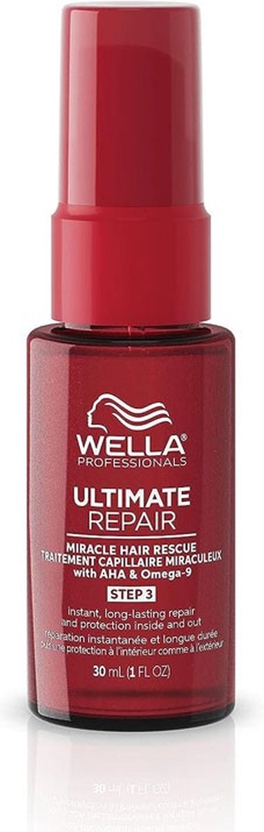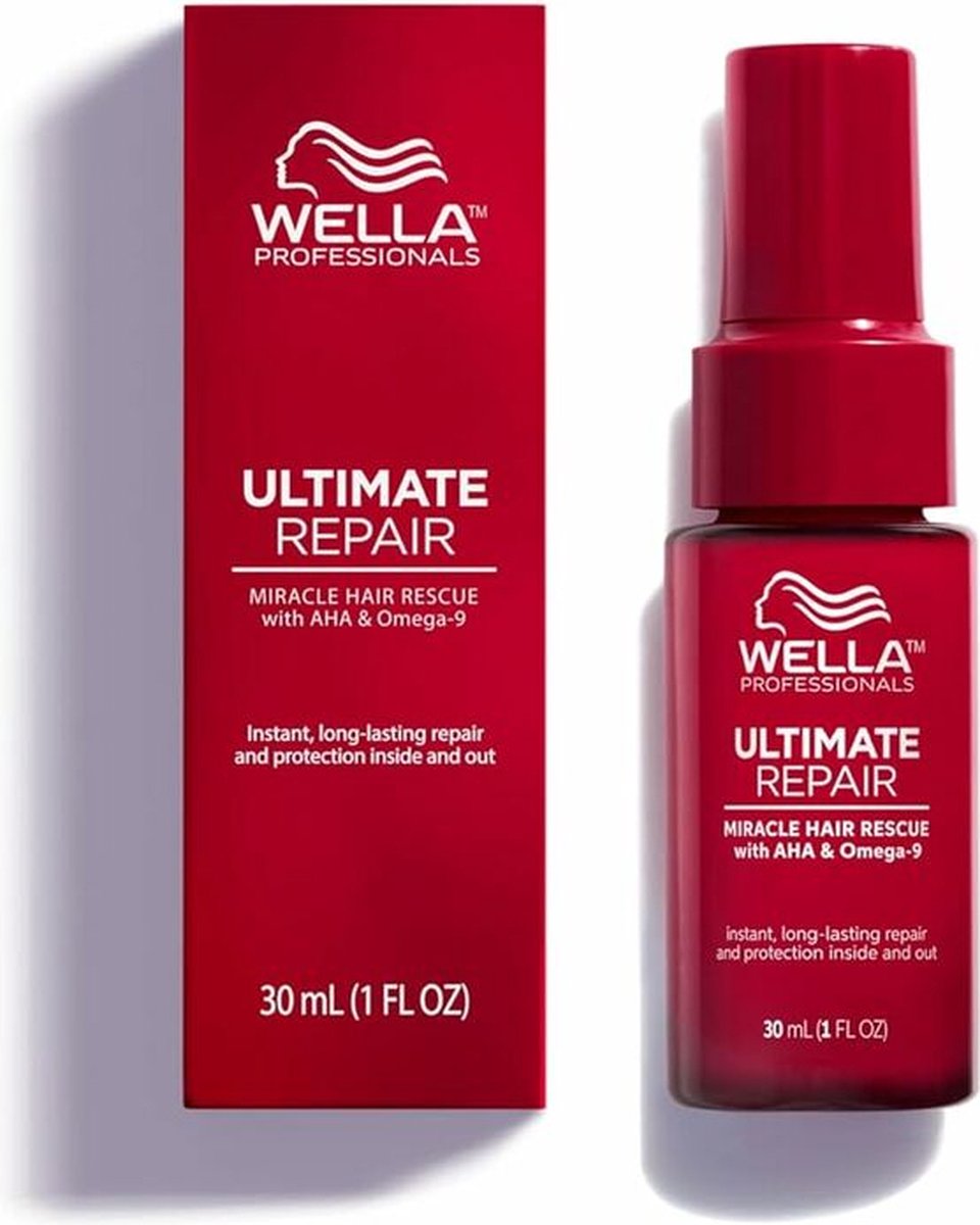 Omschrijving Wella Professionals Ultimate Repair Miracle Hair Rescue is een hair booster treatment die beschadigd haar in 90 seconden herstelt en intensief versterkt. Deze luxe leave-in hair booster spray is dé ultieme redding voor beschadigd haar. In slechts 90 seconden helpt deze alleskunner haarschade te herstellen. Al na één gebruik is het haar 12x gladder* en zichtbaar gezonder. Ook heeft het haar 99% minder haarbreuk* en een fantastische glans die tot wel vier wasbeurten aanhoudt**. De Ultimate Miracle hair Rescue spray bevat Alpha Hydroxy Acid (AHA) en Omega 9. AHA helpt de binnenkant van het haar te herstellen en opnieuw op te bouwen en Omega 9 vult de beschadigde buitenkant van het haar op. Dit samen zorgt voor een perfecte combinatie om allerlei soorten haarbeschadigingen te herstellen. Naast een sterk herstellend vermogen heeft de professionele leave-in spray ook een anti-klit werking op nat haar. De Wella Ultimate Repair Miracle Hair Rescue spray is vegan en geschikt voor alle haartypen en texturen, en is dermatologisch getest. *ten opzichte van een niet verzorgende shampoo **Bij gebruik van Ultimate Repair stappen 1, 2 & 3 Gebruik 1. Breng 10-20 pompjes Ultimate Repair Miracle Hair Rescue aan op handdoekdroog haar na het wassen. 2. Kam voorzichtig door 3. Laat 90 seconden inwerken. Niet uitspoelen. 4. Voor het ultieme resultaat gebruik je de Ultimate Repair Miracle Hair Rescue samen met stap 1 Ultimate Repair Shampoo, stap 2 Ultimate Repair Conditioner, en stap 4 Protective Leave In. Resultaat Wella Professionals Ultimate Repair Miracle Hair Rescue spray herstelt beschadigd haar in 90 seconden waarna het haar er gladder, glanzender en gezonder uitziet.